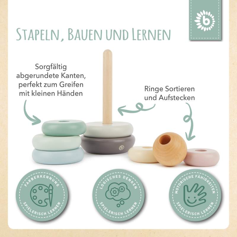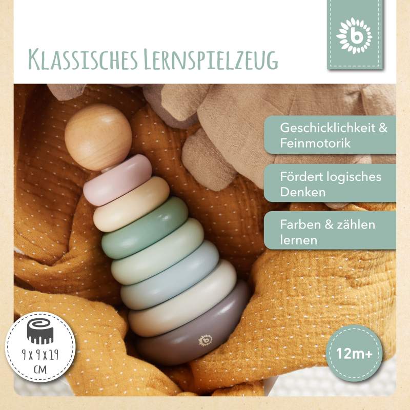• PÄDAGOGISCH WERTVOLL: Dieser Stapelturm Baby mit runden Holzbausteinen ist ideal zum Stapeln, Bauen und Lernen. Er stärkt die Geschicklichkeit und Feinmotorik sowie die Fähigkeit, Größen zuzuordnen, auf spielerische Art