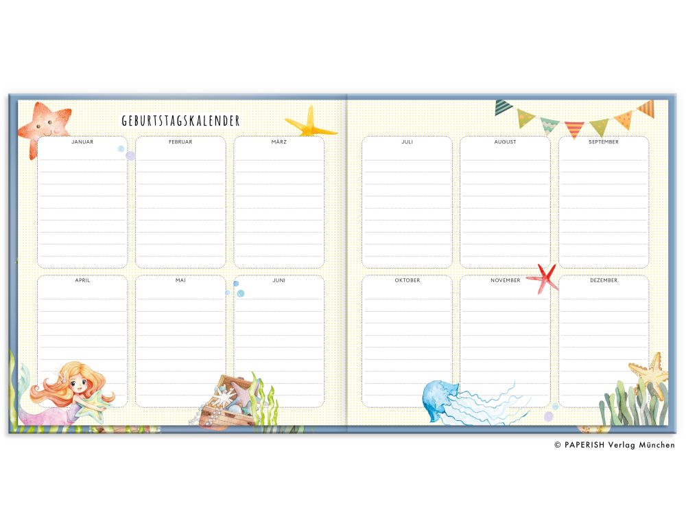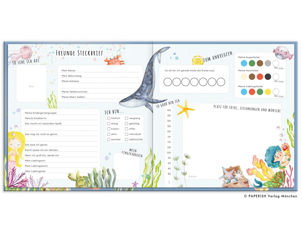 Ein ganz besonderes Freundebuch für begeisterte Meerjungfrauen Freunde und ihre ersten Begleiter und Begleiterinnen im Kindergarten. Fantasievolle Meerjungfrauen und Meeresbewohner führen durch ein wundervolles Freundealbum, indem jeder auf besondere Weise eingeladen wird, sich zu verewigen – damit die ersten Freundschaften im Leben nicht vergessen werden und später wieder aufleben können. Auf 72 Seiten kann man reichlich Fragen beantworten, ankreuzen, ausmalen und mitmachen um auf natürliche Weise die soziale Bindung und persönliche Kreativität zu fördern. Damit das Freundschaftsbuch auch lange Freude bereitet, sind die Seiten besonders stabil und der Einband des Buches fest und folienkaschiert. Und für das gewisse Etwas gibt es eine wunderschöne Goldfolienprägung auf dem Cover des Buches, so kann jeder erkennen dass es sich um ein einzigartiges, persönliches Erinnerungsstück handelt. Ein besonderes Geschenk für die Zeit im Kindergarten und die ersten Geburtstage mit Freunden!