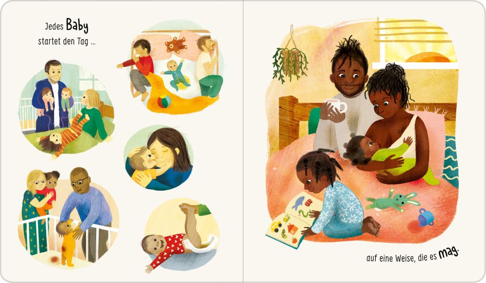 Das Leben mit Babys ist bunt und vielfältig – und Familien sind es ebenso! Doch dies ist bei allen gleich: Es wird zusammen gelacht, gespielt, gegessen … und schließlich geschlafen! Das Buch zeigt den Baby-Alltag sehr authentisch, mit allen Facetten und Themen, die dazugehören. Dies beschert dem Kind zahlreiche Wiedererkennungsmomente und lädt die Betrachtenden zum gemeinsamen Erzählen ein.Ein Pappbilderbuch, das schon Kinder ab 12 Monaten anspricht