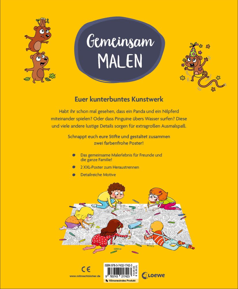 Die meisten Kinder haben Spaß am Malen. Viele kleine Künstler*innen freuen sich dabei aber auch über Unterstützung, egal ob von Geschwistern, Freund*innen oder Erwachsenen. Deshalb sorgt diese besondere Malbuchreihe gezielt für gemeinschaftlichen Malspaß. Dank der Perforierung können die riesigen Poster leicht herausgetrennt werden. Sie bieten genug Platz, um der Kreativität freien Lauf zu lassen und zusammen ein Bild zu gestalten. Dabei wird ganz nebenbei auch die soziale Kompetenz aller Beteiligten gestärkt. Und sind die Bilder dann ausgemalt, verschönern sie garantiert jedes Kinderzimmer!
