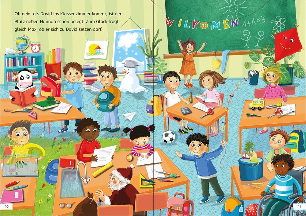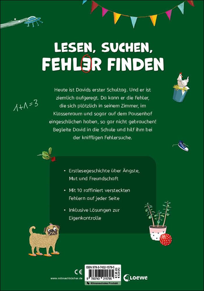Heute ist Davids erster Schultag. Und er ist ziemlich aufgeregt. Da kann er die Fehler, die sich plötzlich in seinem Zimmer, im Klassenraum und sogar auf dem Pausenhof eingeschlichen haben, so gar nicht gebrauchen! Begleite David in die Schule und hilf ihm bei der kniffligen Fehlersuche.