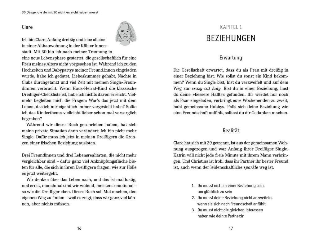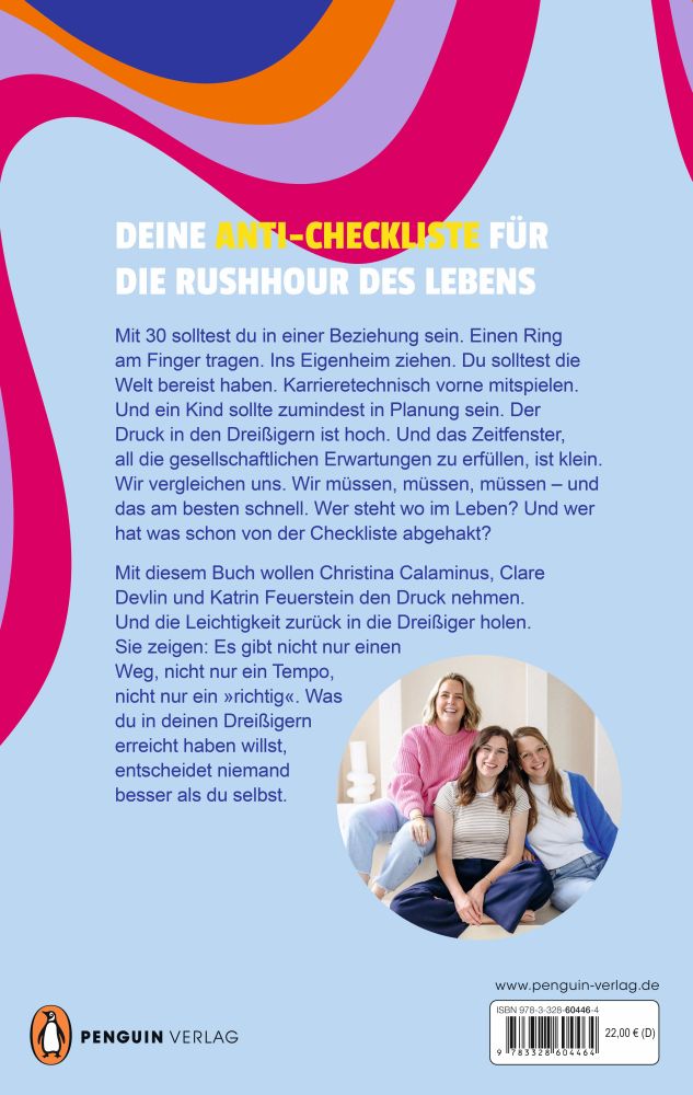 Mit 30 solltest du in einer Beziehung sein. Schön wäre ein Ring am Finger oder in Aussicht. Du solltest die Welt bereist haben. Karrieretechnisch vorne mitspielen. Deinen Haushalt im Griff haben. Und ein Kind sollte zumindest in Planung sein. Da ist sie, die Rush Hour des Lebens. Mit dem 30. Geburtstag fangen Druck und Vergleiche an: Wer steht wo im Leben? Wer hat schon was erreicht? Wem geht es besser? Genau diesen Druck wollen die Autorinnen mit ihrem Buch nehmen, mithilfe einer Anti-Checkliste: 30 Dinge, die du mit 30 nicht erreicht haben musst. Christina, Clare und Katrin erzählen ihre persönlichen Geschichten und zeigen dir, wie du mit individuellen und gesellschaftlichen Erwartungen umgehen kannst. Denn was es bedeutet, 30 zu sein – das entscheidet niemand besser als du selbst.