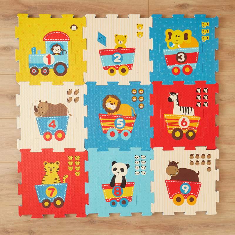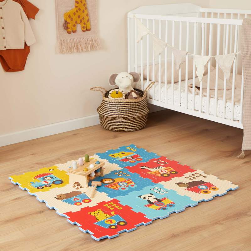 Diese wunderschöne Baby Matte mit 9 Tieren in Wagons und Zahlen ist eine hervorragende Puzzle Matte für Jungen und Mädchen, zum Spielen und Lernen. Beim Zusammensetzten und auseinandernehmen wird das Denkvermögen und die Geschicklichkeit der Kleinen trainiert. Die Baby Spieldecke ist aus weichem Schaumstoff, schad stofffrei und eignet sich hervorragend als Kinder Spiel Teppiche für Wohnzimmer, Tanzmatte für Kinder, Wasserspielmatte Baby oder auch als Krabbeldecken Baby. Ein kleiner Teppich für viele Möglichkeiten, welcher in keinem Kinderzimmer für Mädchen oder Jungen fehlen sollte. Die Puzzelmatte Baby ist ein geeignetes Puzzle ab 12 Monate, mit dem Du Dein Liebling die Zahlen von 1 bis 9 näherbringst. Jedes Puzzleteil hat eine Größe von ca. 30x30x1 cm. Die Matte kann als Quadrat oder als Würfel zusammengesetzt werden und bietet so vielfältige Spielmöglichkeiten. Außerdem können die Tiere aus der Mitte herausgetrennt und so einzeln zum Spielen verwendet und als Zug zusammengesetzt werden. Die Marke Bieco steht seit vielen Jahren für höchste Qualität und innovative Produktentwicklung. Unsere Spielwaren für Babys und Kleinkinder unterliegen allesamt den strengsten Richtlinien deutscher Produkt- und Sicherheitsstandards. Bieco möchte Kindergesichter zum Leuchten bringen, deshalb werden alle Designs für unsere Kleinen mit Liebe gefertigt. Artnr: 19003764